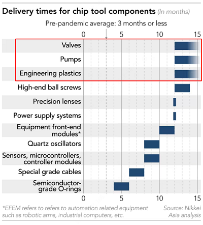 而2019年疫情爆发前,这些零部件的交期平均约为3-4个月,在芯片短缺的2021年交期一般也在10-12个月。